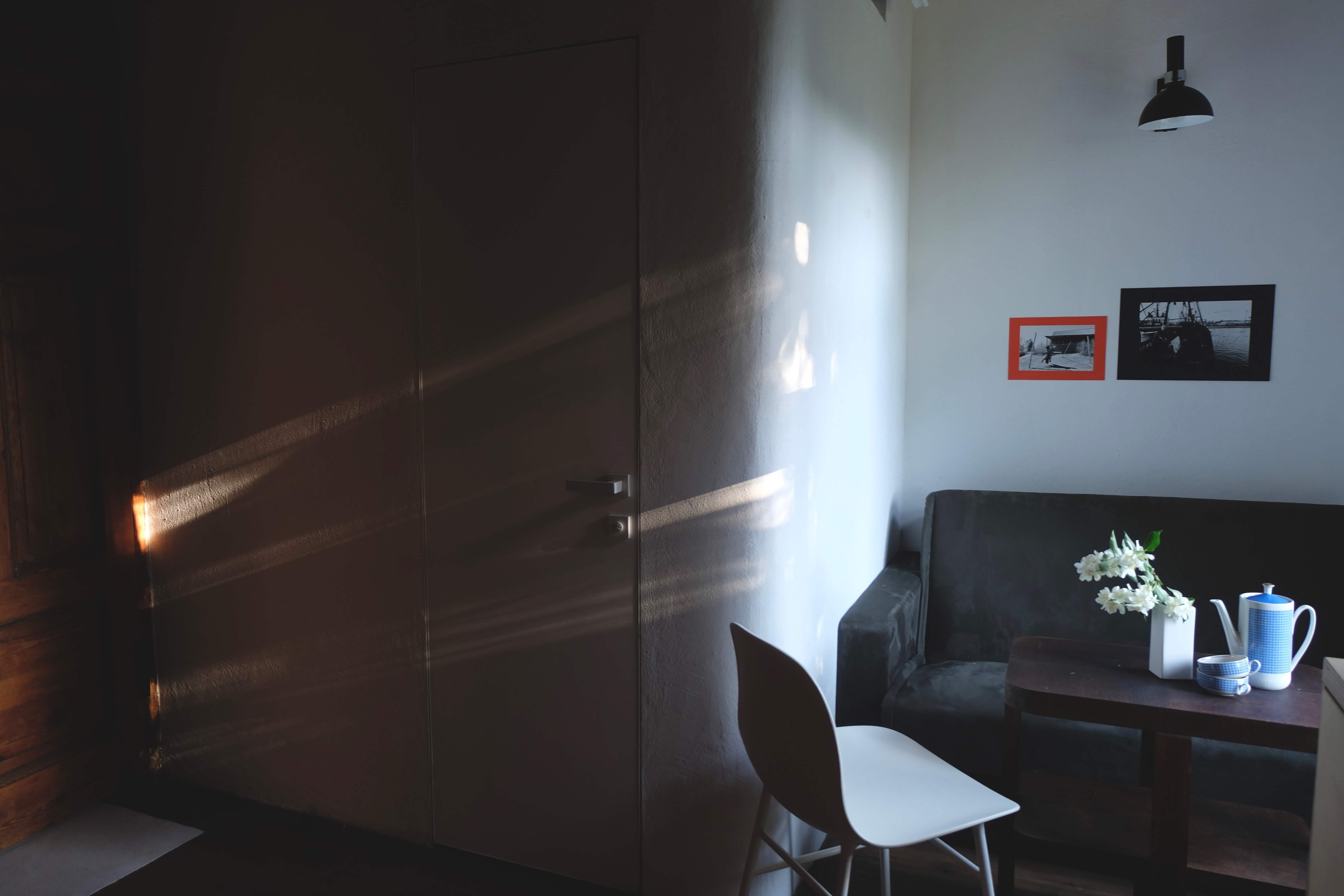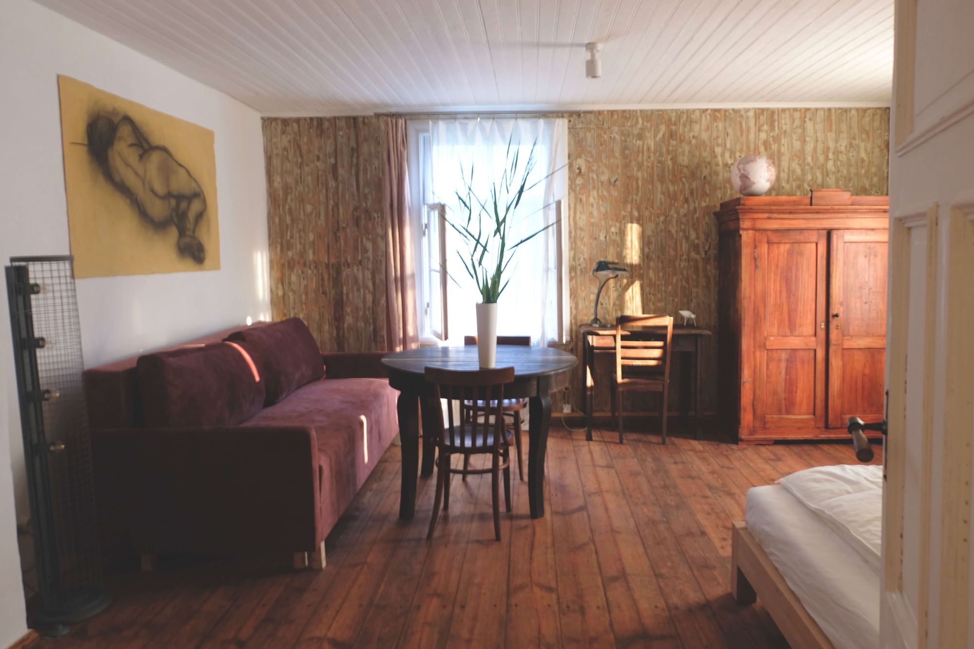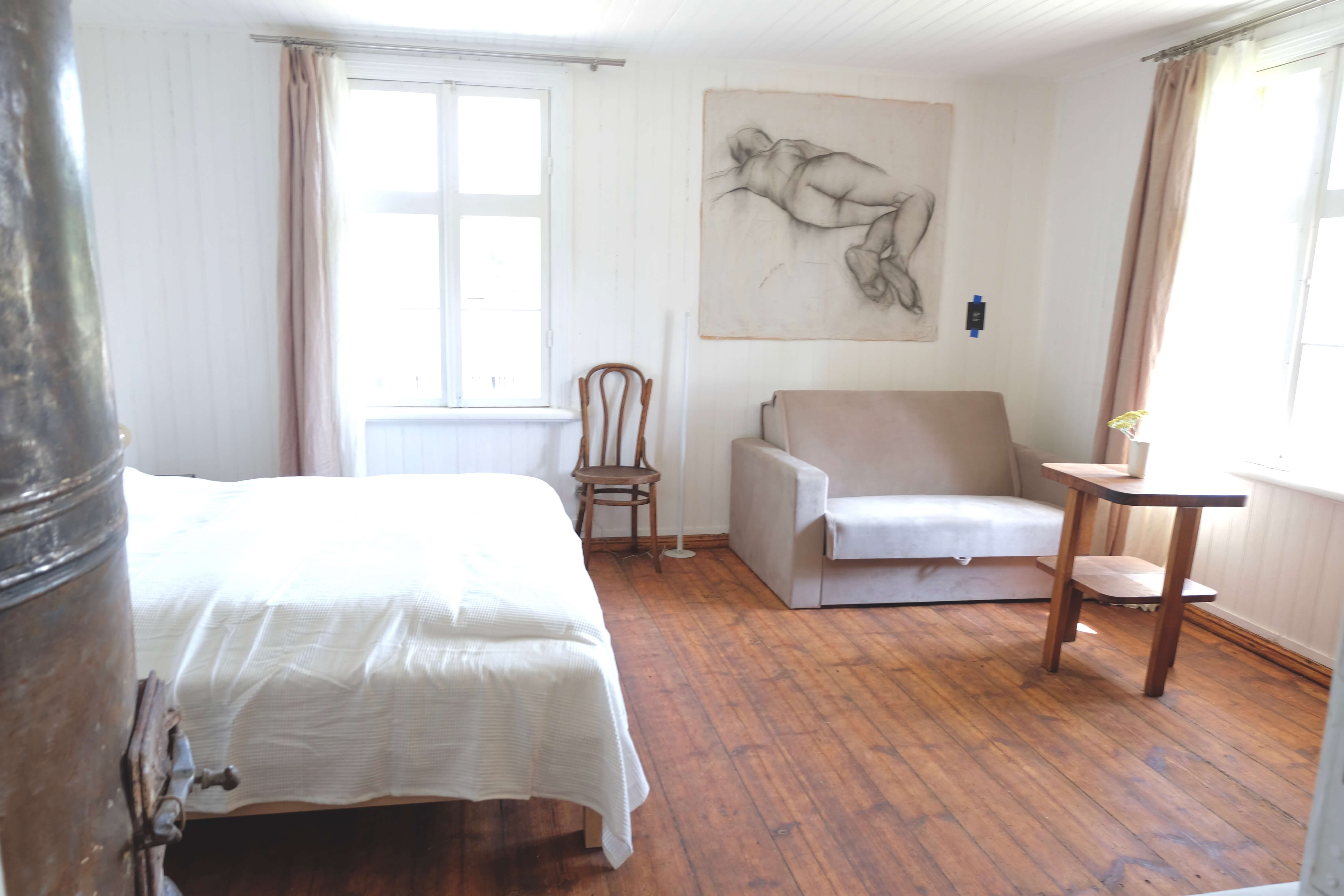 Mākslinieka apartamenta vakara gaisma, kas visu padara skaistāku. Iekurtu uguni virtuves malkas plītī var vērot, kaut atlaižoties virtuves dīvānā. Māksliniekā ir guļamistaba ar lielu divguļamo gultu un izvelkamu dīvānu, virtuve ar malkas plīti un dīvānu, vannasistaba.